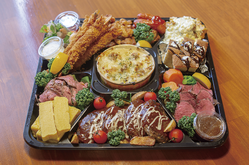 有頭エビフライ・からあげ・だし巻き玉子・チキン南蛮・サイコロステーキ・国産牛100%手ごねハンバーグ・ウインナー・生春巻(エビとローストビーフ)・シフォンケーキ